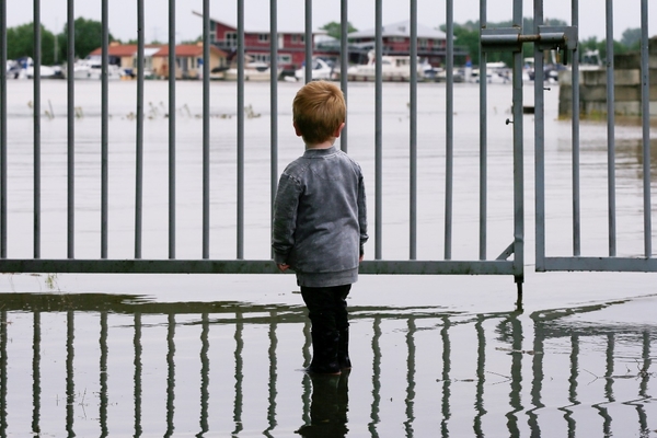 當地時間7月16日,在荷蘭,一個孩子在觀看水漫過圍欄。
