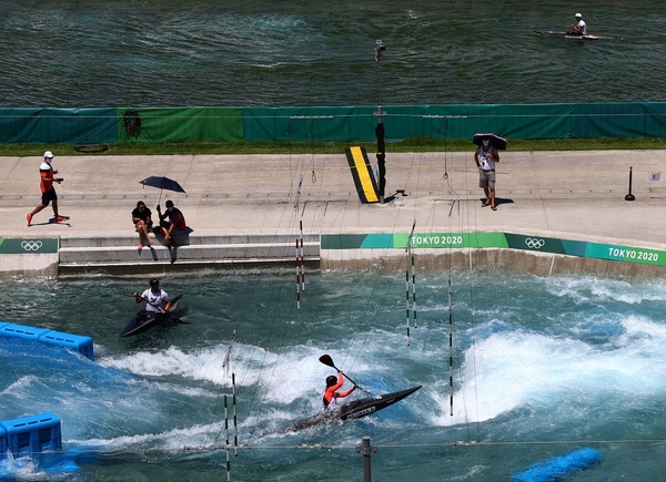當地時間7月17日,在日本東京,運動員們在2020年東奧葛西皮划艇激流迴旋中心進行訓練。