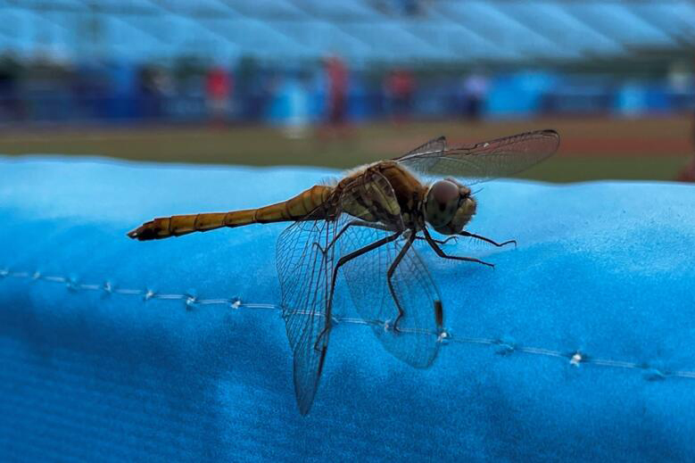 當地時間7月21日,在日本福島舉行的東奧壘球比賽期間,一隻蜻蜓闖入攝影師的鏡頭。