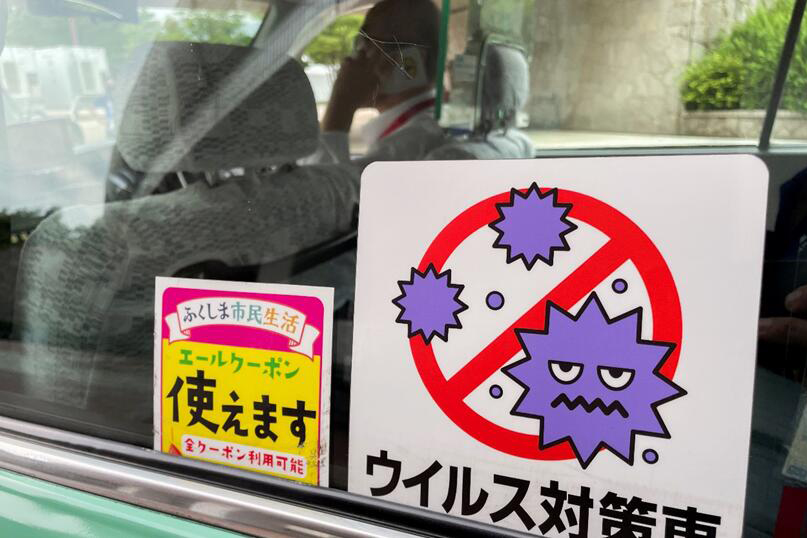 當地時間7月22日,在日本福島舉行的東奧壘球比賽期間,球場外的計程車上張貼有對抗病毒相關標識。