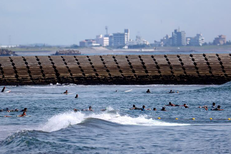 當地時間7月23日,在日本一宮,東奧之前,當地居民在釣崎海岸衝浪會場附近的海裏游泳。