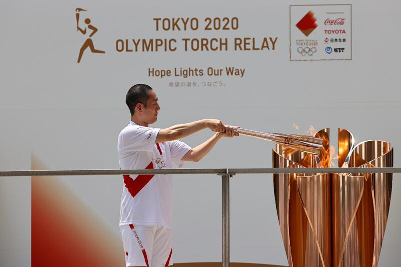 當地時間7月23日,在日本東京新宿的奧運聖火抵達儀式上,最後一名火炬手、歌舞伎演員中村勘九郎點燃聖火台。