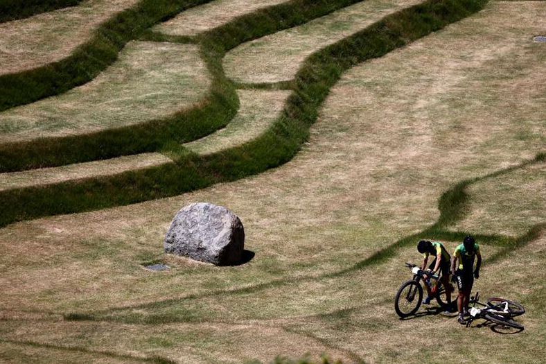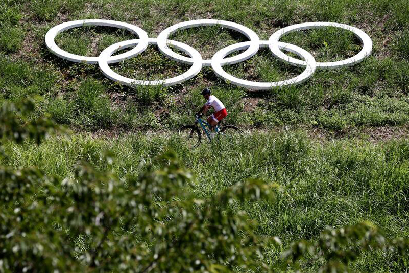 當地時間7月23日,山地單車運動員在日本靜岡伊豆山地單車賽道進行訓練。