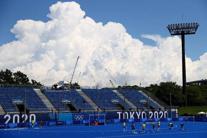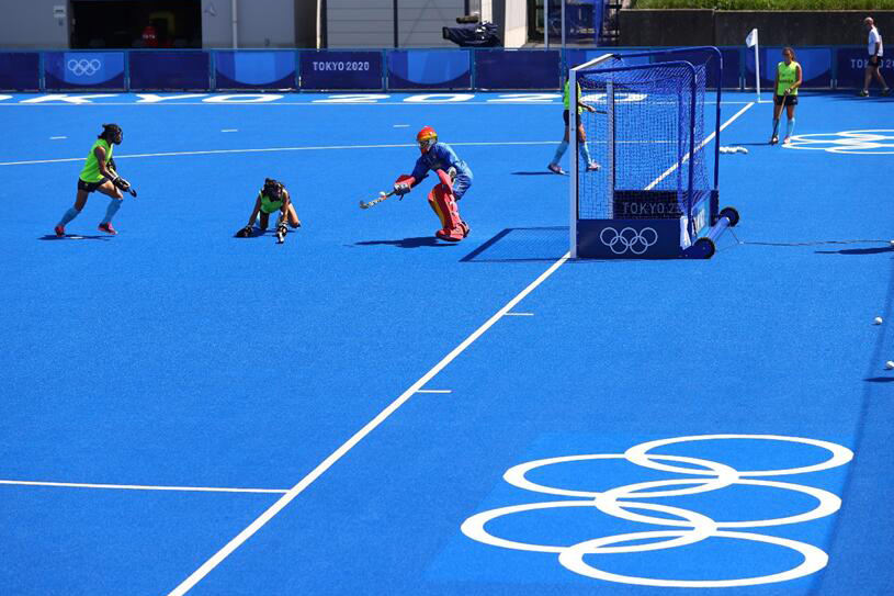 當地時間7月23日,在日本大井曲棍球競技場,曲棍球運動員在進行訓練。