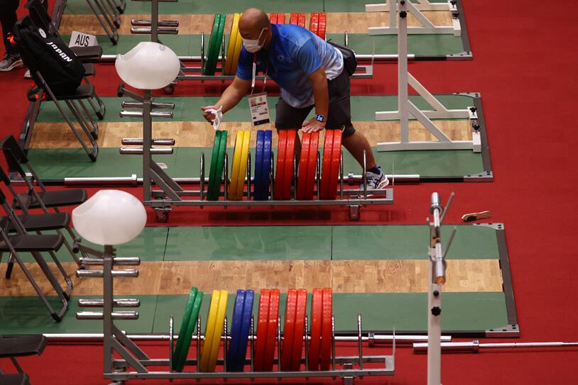 當地時間7月23日,舉重運動員在進行訓練。還有工作人員對器械進行消毒。