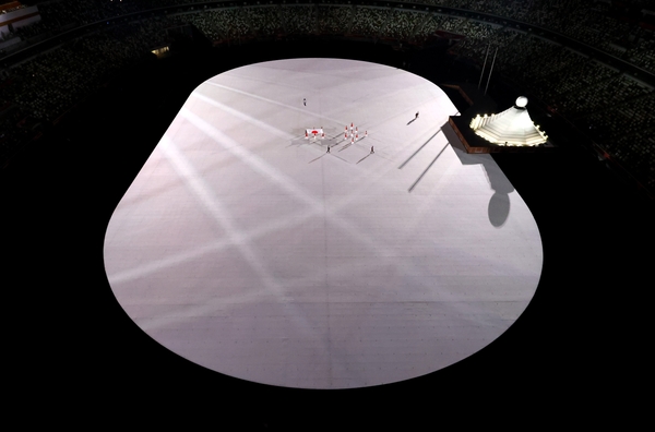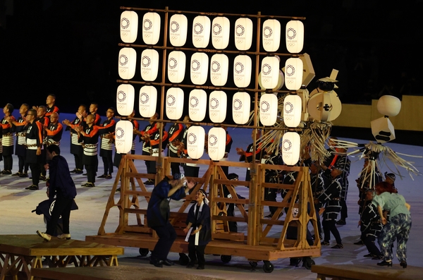 日本舞蹈家森山未來透過舞蹈,紀念在疫情下被奪走性命的人,之後全場起立默哀。緊接由一群穿着日本江戶時代民族服裝的舞蹈員,配合敲擊樂及舞蹈,逐步拼出木造的奧運五環,以將1964東京奧運與今次東京奧運連結在一起。(圖源:路透社)
