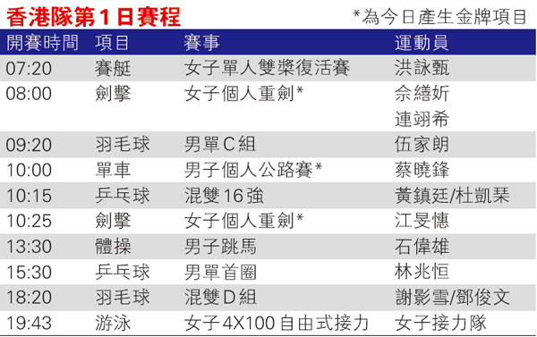 經過23日(周五)的開幕禮後,東京奧運會於24日正式進入首個有金牌產生的比賽日。香港隊選手將會分別出戰劍擊、羽毛球、乒乓球、體操、游泳及公路單車等項目,當中女子個人重劍賽事,3位劍手江旻憓、佘繕妡及連翊希乃是有力為港隊衝擊獎牌。