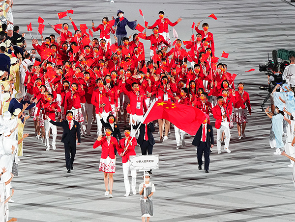 隨後,各代表團開始入場。中國代表團於第110順位邁入主場館,擔任旗手的分別是女排運動員朱婷、跆拳道運動員趙帥。儘管備戰困難重重,中國代表團仍創下境外參賽規模和參加小項數量新高。目前777人組成的中國體育代表團已有515人抵達日本,來自27個項目29支國家隊。