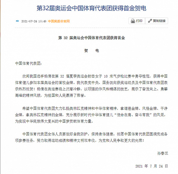 據中國奧委會官網消息,7月24日,中國射擊運動員楊倩在東京獲得第32屆夏季奧運會首枚金牌。中共中央政治局委員、國務院副總理孫春蘭代表黨中央、國務院向中國體育代表團發來賀電。