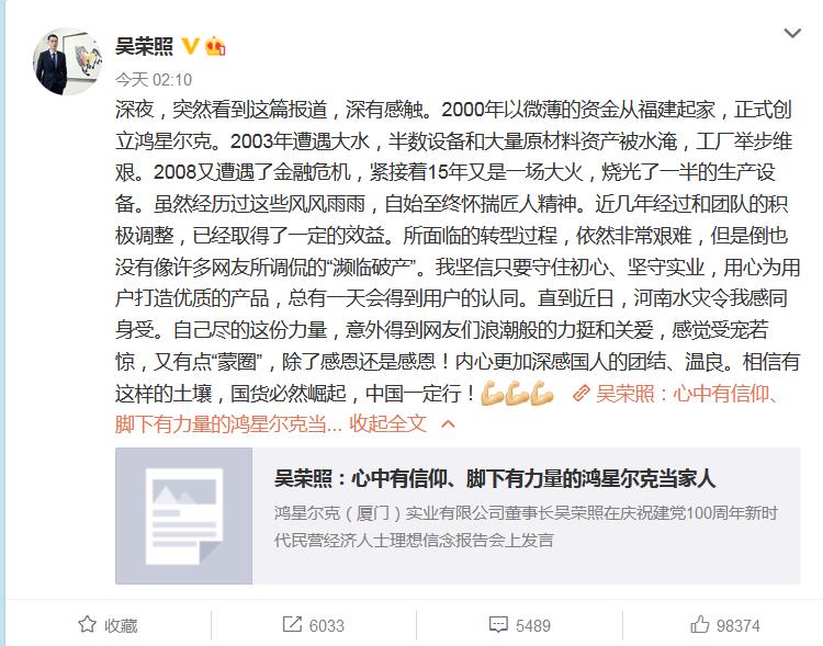 7月25日凌晨,鴻星爾克總裁吳榮照在微博表示,近幾年經過和團隊的積極調整,已經取得了一定的效益。所面臨的轉型過程,依然非常艱難,但是倒也沒有像許多網友所調侃的「瀕臨破產」。我堅信只要守住初心、堅守實業,用心為用戶打造優質的產品,總有一天會得到用戶的認同。