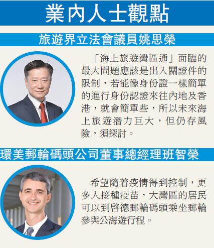 姚思榮續指,根據國家最新人口普查,大灣區人口超過7000萬,海上旅遊灣區若能成真,最大問題應該是出入關證件的限制,若能像身份證一樣簡單的進行身份認證來往內地及香港,就會簡單些,而持護照的旅客,在這方面安排就有些複雜,因為他可能跟隨郵輪去到內地也可能去到海外,所以在技術上就有風險,所以未來海上旅遊潛力巨大,但仍存在一些風險,需要進一步探討。