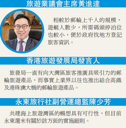 香港旅遊發展局發言人回覆本報記者查詢時表示,旅發局一直有向大灣區旅客推廣具吸引力的郵輪旅遊產品,而事實上業界以往也推出結合高鐵及港珠澳大橋的郵輪旅遊產品。待跨境郵輪航線可重啟後,旅發局亦會重新向內地及國際市場進行相關的推廣。永東旅行社副營運總監陳少芳接受訪問時表示,共建海上旅遊灣區的倡議具有可行性,但目前永東還未有該方面的實施細則。