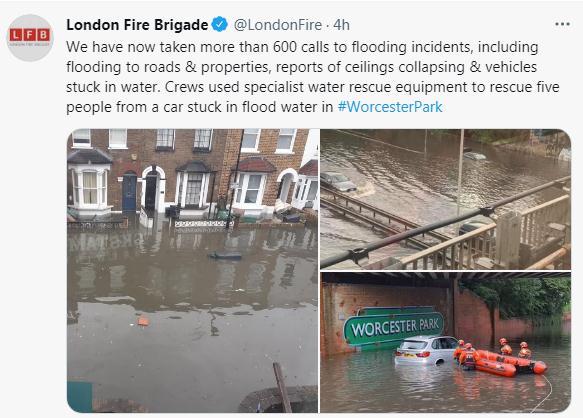 倫敦市長薩迪克·汗在社交網站上表示,應急服務正在應對「倫敦各地的嚴重洪水」。他補充說,所有公共交通服務都受到影響,建議人們避免步行或開車通過洪水地區。