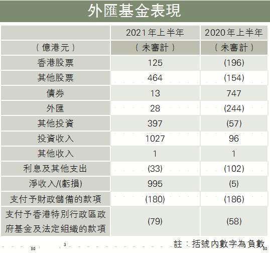 受去年同期疫情打擊基數較低影響,本港外匯基金上半年投資收入達1027億元,比去年同期的96億元,按年大增9.7倍,當中未包括第二季其他投資收益。