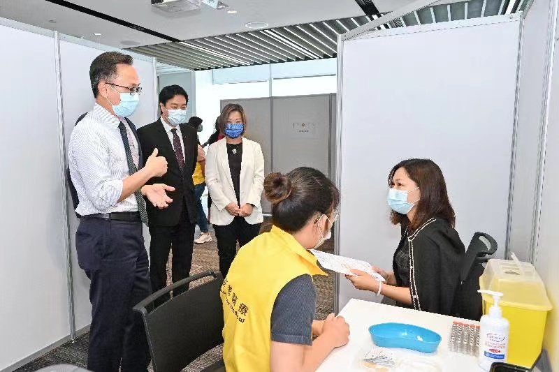公務員事務局局長聶德權今日到訪AXA安盛,與該公司行政總裁尹玄慧一起,視察該企業員工及代理人透過政府外展服務接種新冠疫苗的情況。外展隊預計分兩天,為約360人接種科興或復必泰疫苗。