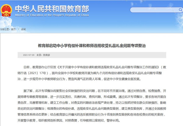 據中國教育部網站28日消息,日前,教育部辦公廳印發《關於開展中小學有償補課和教師違規收受禮品禮金問題專項整治工作的通知》,面向全國中小學校和教師開展為期9個月的有償補課和違規收受禮品禮金問題專項整治,進一步規範中小學教師職業行為,營造風清氣正的育人環境,促進中小學生健康全面發展。
