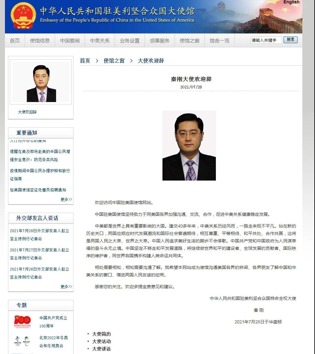秦剛在駐美使館「大使歡迎辭」中寫道,中國駐美國使館堅持致力於同美國各界加強溝通、交流、合作,促進中美關係健康穩定發展。