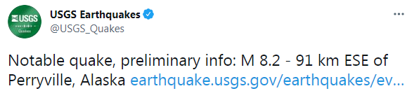 美國地質調查局(USGS)起初把地震定為7.2級,後來修正為8.2級。震中距離阿拉斯加佩里維爾(Perryville)約91公里。