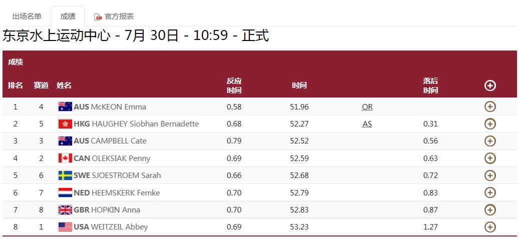 女子100米自由泳決賽中,澳洲選手艾瑪·麥基翁以刷新奧運會紀錄的成績51秒96奪冠;中國香港選手何詩蓓繼斬獲200米自由泳金牌創造歷史後,再奪一枚銀牌,52秒27的成績刷新了女子100自亞洲紀錄;另一位澳洲選手凱特·坎貝爾收獲銅牌,成績為52秒52。(圖源:路透社)