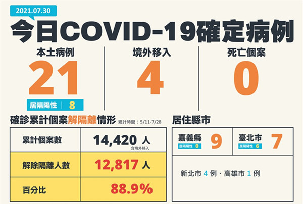 台灣地區流行疫情指揮中心7月30日公布,新增21例本土新冠肺炎確診病例,無新增死亡病例。另有4例境外輸入個案。