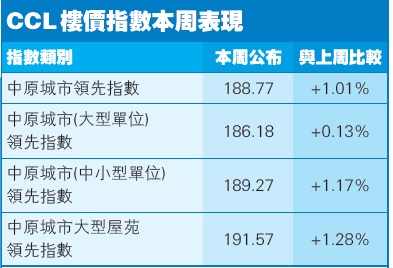 中原城市大型屋苑領先指數CCL Mass報191.57點,為歷史第三高,按周升1.28%,升幅為13周最大。CCL(中小型單位)報189.27點,創104周最大,按周升1.17%,升幅為13周最大。CCL(大型單位)報186.18點,按周升0.14%,連升3周共0.95%。