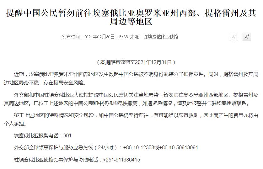 中國領事服務網7月30日消息,中國駐埃塞俄比亞使館稱,近期,埃塞俄比亞奧羅米亞州西部地區發生數起中國公民被不明身份武裝分子扣押案件。同時,提格雷州及其周邊地區局勢不穩,存在極高安全風險。