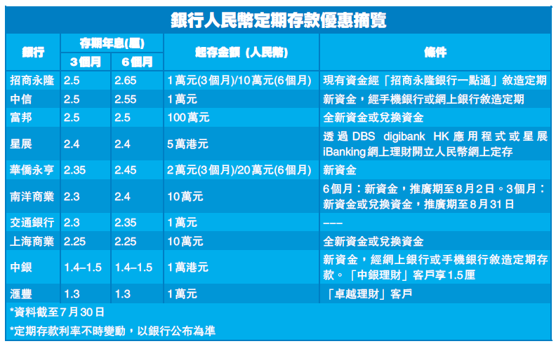 以下即來比較銀行提供的人民幣定存優惠。以存期6個月為例,截至目前為止,以招商永隆銀行息率最高,年息達2.65厘。經該行的手機銀行服務敘造定期存款,可享有關定期存款息率優惠。但入場費較高,需要10萬元(人民幣,下同)。同樣享有高息,但入場費較低的,可以選擇中信銀行,存期6個月的年息為2.55厘,入場金額僅1萬元。