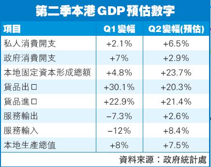 政府統計處公布,香港今年第二季度經濟預估按年增長7.5%,略遜市場預期的7.8%。政府發言人稱,第二季經濟復蘇仍然不平衡,雖然貨物出口表現強勁,並超越2018年同期高峰,但旅遊業仍然停頓;而與消費相關的活動,雖進一步改善,但仍明顯低於衰退前的水平。