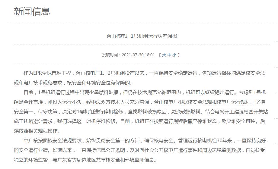 中廣核稱,台山核電廠1號機組運行過程中出現少量燃料破損,但仍在技術規範允許範圍內,機組可以繼續穩定運行。考慮到1號機組是全球首堆,剛投入運行不久,經中法雙方技術人員充分溝通,台山核電廠根據核安全法規和核電廠運行規程,堅持安全第一、保守決策,決定對1號機組進行停機檢修,查找燃料破損原因,更換破損燃料。結合電網開工建設粵西開關站施工線路避讓需求,所以選擇這一時機停堆檢修。目前,機組正在按照運行規程後撤至停堆狀態,反應堆安全可控。後續按照相關規程操作。