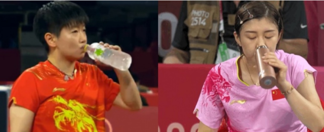 有意思的是,比賽轉播中捕捉到兩個人喝水的畫面。1994年出生的陳夢端著保溫杯一口一口抿著喝,2000年出生的孫穎莎抱着冰水大口暢飲。