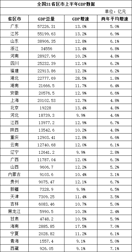 內地31省區市經濟半年報:11省市GDP總量超2萬億元