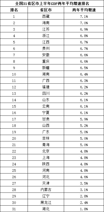 從兩年平均增速看,16個省區市跑贏全國5.3%的平均增速。其中,西藏兩年平均增速全國第一。數據顯示,西藏上半年全區地區生產總值926.05億元,同比增長9.1%,兩年平均增長7.1%。此外,海南、江蘇兩年平均增速分別為7%、6.9%,排名全國第二和第三。