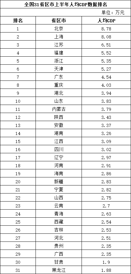 此外,江蘇、福建、浙江、天津等4省市,上半年人均GDP也超過5萬元,其中江蘇為6.51萬元排名全國第三。
