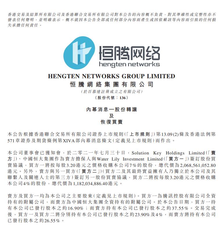 8月1日,恒騰網絡發布公告,騰訊以每股3.2港元向恒大收購恒騰網絡7%股份,合計20.7億港元;同時,恒大向獨立協力廠商轉讓恒騰網絡4%股份,合計11.8億港元。