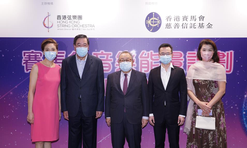 香港弦樂團創辦人姚珏、立法會主席梁君彥、香港弦樂團主席陳永棋、香港賽馬會慈善及社區事務執行總監張亮及香港弦樂團董事局成員蔡黃玲玲。