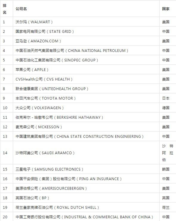 8月2日,《財富》世界500強排行榜發布。受新冠疫情影響,今年《財富》世界500強排行榜企業的營業收入約為31.7萬億美元,比去年下降5%。今年,沃爾瑪連續第八年成為全球最大公司,中國的國家電網公司上升至第二位,亞馬遜首次進入前三,蘋果公司前進至第6位。