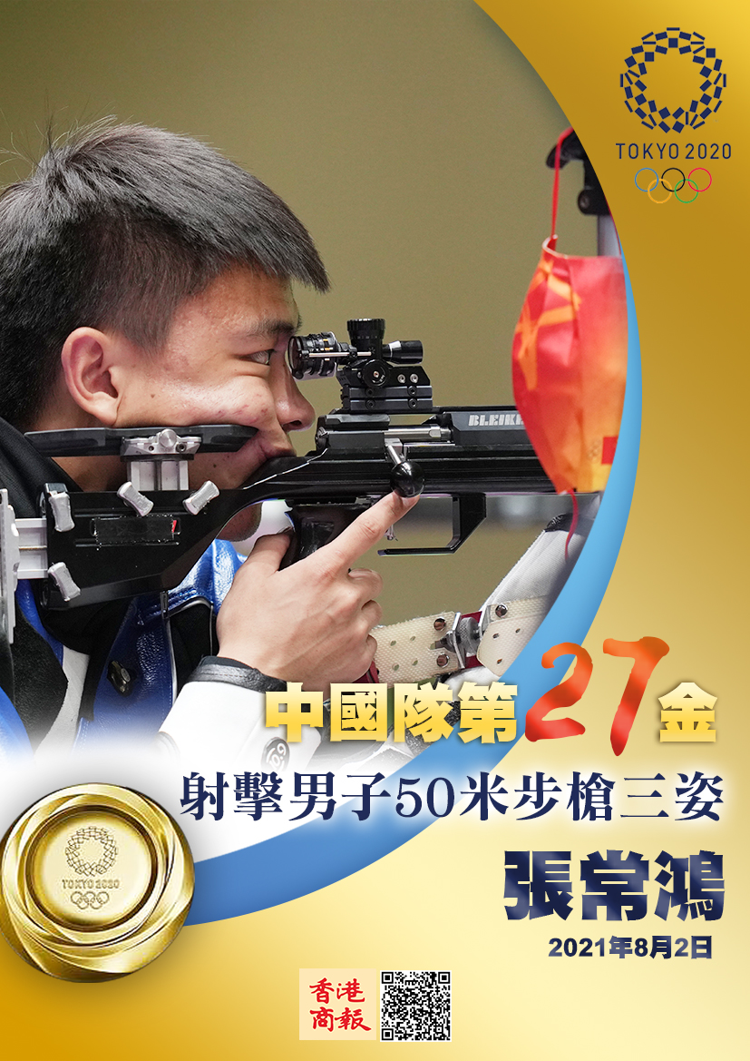 中國選手張常鴻打出466環,以打破世界紀錄和奧運會紀錄的成績獲得金牌,這也是本屆奧運會中國代表團的第27枚金牌,同時也是射擊項目的最後一枚金牌!