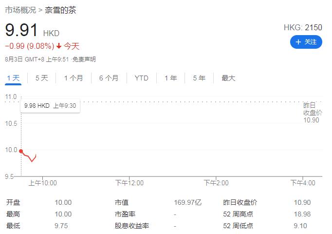 作為茶飲第一股,6月30日,奈雪的茶以19.8港元/股的發行價在港股上市,總市值為340億港元。截至發稿,奈雪股價跌近9.3%,報9.91港元,與上市發行價相比跌近50%。(圖源:新華社資料圖、截圖)