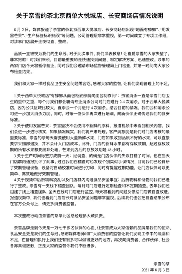 8月3日淩晨,@奈雪的茶Nayuki 微博發布情況說明稱,8月2日,媒體報道了奈雪的茶北京西單大悅城店、長安商場店出現「地面有蟑螂」、「用發黑芒果」、「生產標籤標識錯誤」等問題,公司管理層非常重視,第一時間成立了專項工作組,對涉事門店展開連夜徹查、整改。