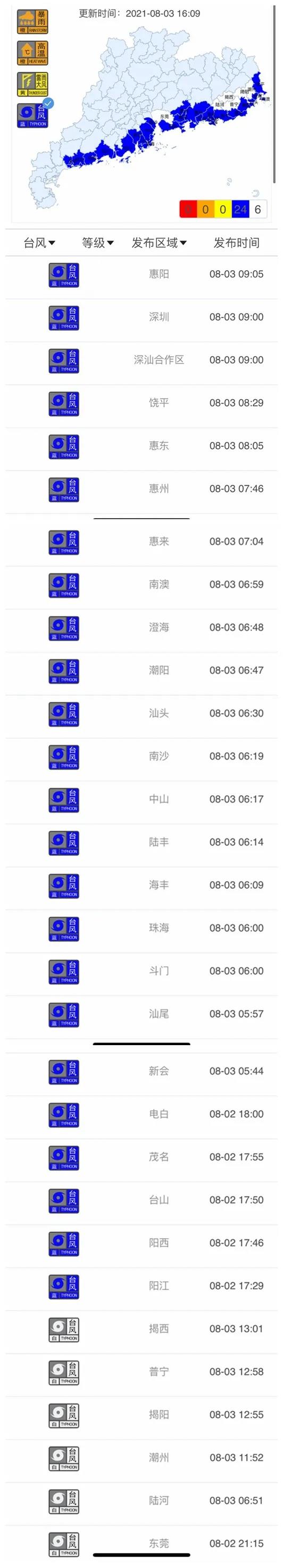 截至8月3日16時09分,廣東省共有30個颱風預警正在生效,其中,24個地方發布了颱風藍色預警信號。