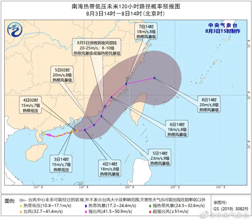 8月3日14時,南海熱帶低壓(7級,15米/秒)中心位於距離珠海金灣海岸東偏南方向約70公里的海面上,預計其將以5公里~10公里的時速沿着廣東近海向偏東北方向移動,強度逐漸加強,有可能於4日夜間到5日白天在珠江口東側到閩南沿海(較大可能粵東,登陸強度9級左右)市縣登陸,也有可能沿廣東近海趨向台灣海峽。