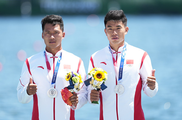 8月3日,2020東京奧運會皮划艇靜水項目在日本東京海之森水上競技場舉行,中國選手劉浩/鄭鵬飛在男子1000米雙人划艇決賽中以3:25.198摘得銀牌,落後冠軍0.203秒。古巴組合獲得金牌,德國組合獲得銅牌。(圖源:新華社)