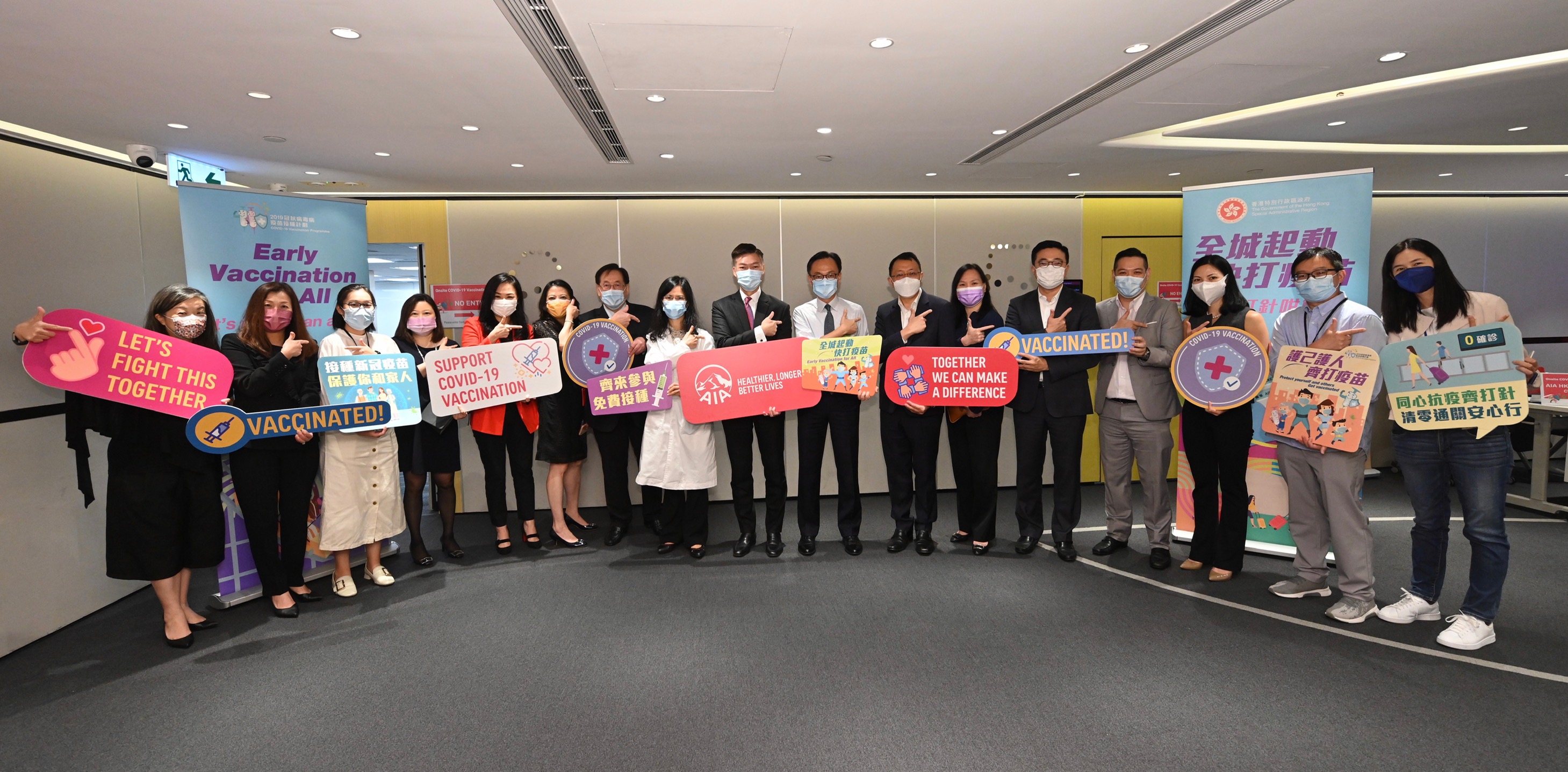聶德權、友邦香港及澳門首席執行官馮偉昌及該企業高層人員和提供今日(3日)外展接種服務的將軍澳體育館社區疫苗接種中心醫護團隊代表一同支持新冠肺炎疫苗接種計劃。