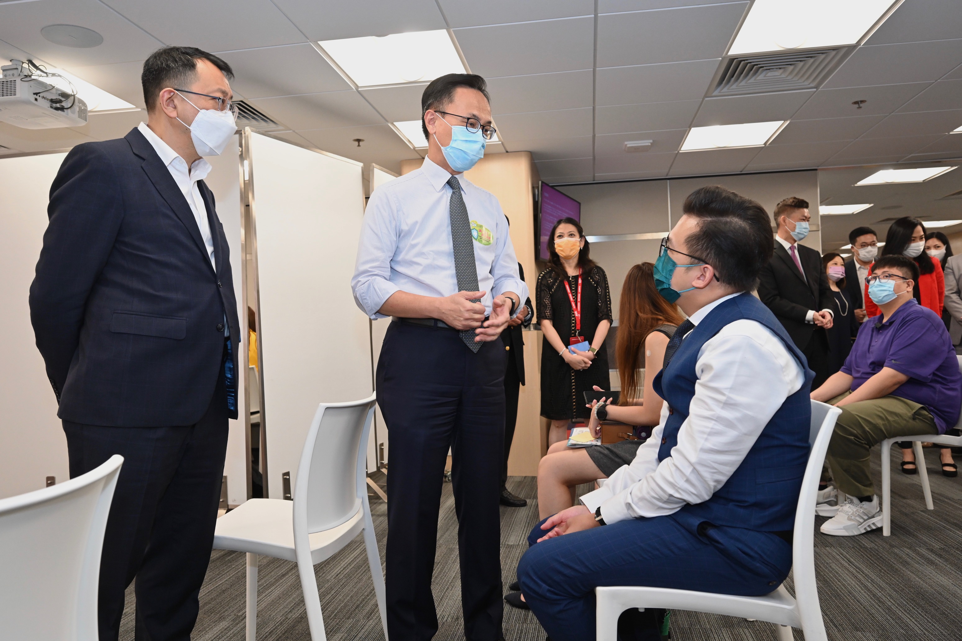 聶德權和友邦香港及澳門營業總經理詹振聲與1名準備接種疫苗人士交談。