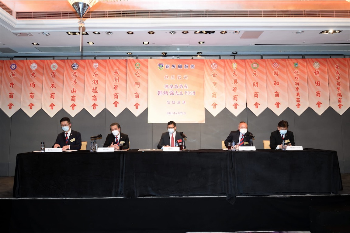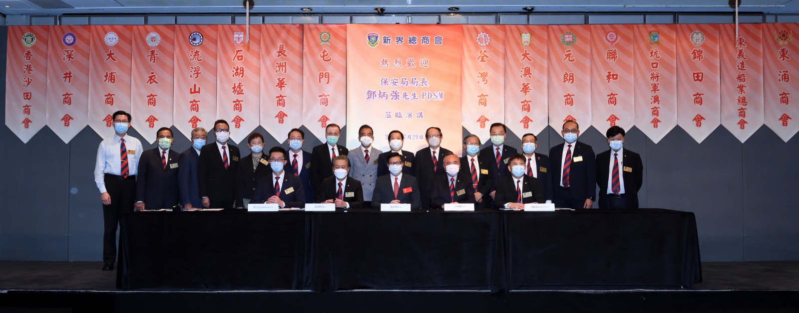 新界總商會日前假美麗華酒店舉辦第十三屆第六次董事會會議,保安局局長鄧炳強應邀主講。會上,他圍繞香港面臨的國安問題進行分析,點出「愛國者治港」的重要性,並總結了香港國安法頒布後的效果。該會會長張德熙、主席王振聲、事務委員會主席彭志宏、會務委員會主席周駿達等首長出席。