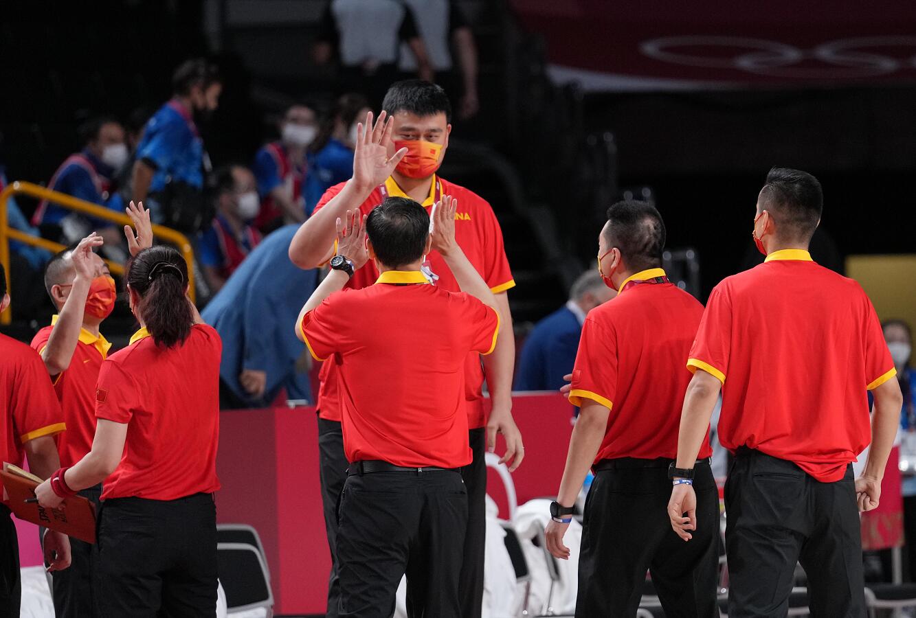 中國籃球隊領隊姚明與教練等慶祝女籃晉級八強。新華社