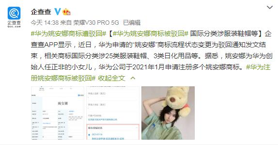 企查查App顯示,近日,華為申請的「姚安娜」商標流程狀態變更為駁回通知發文結束,相關商標國際分類涉25類服裝鞋帽、3類日化用品等。