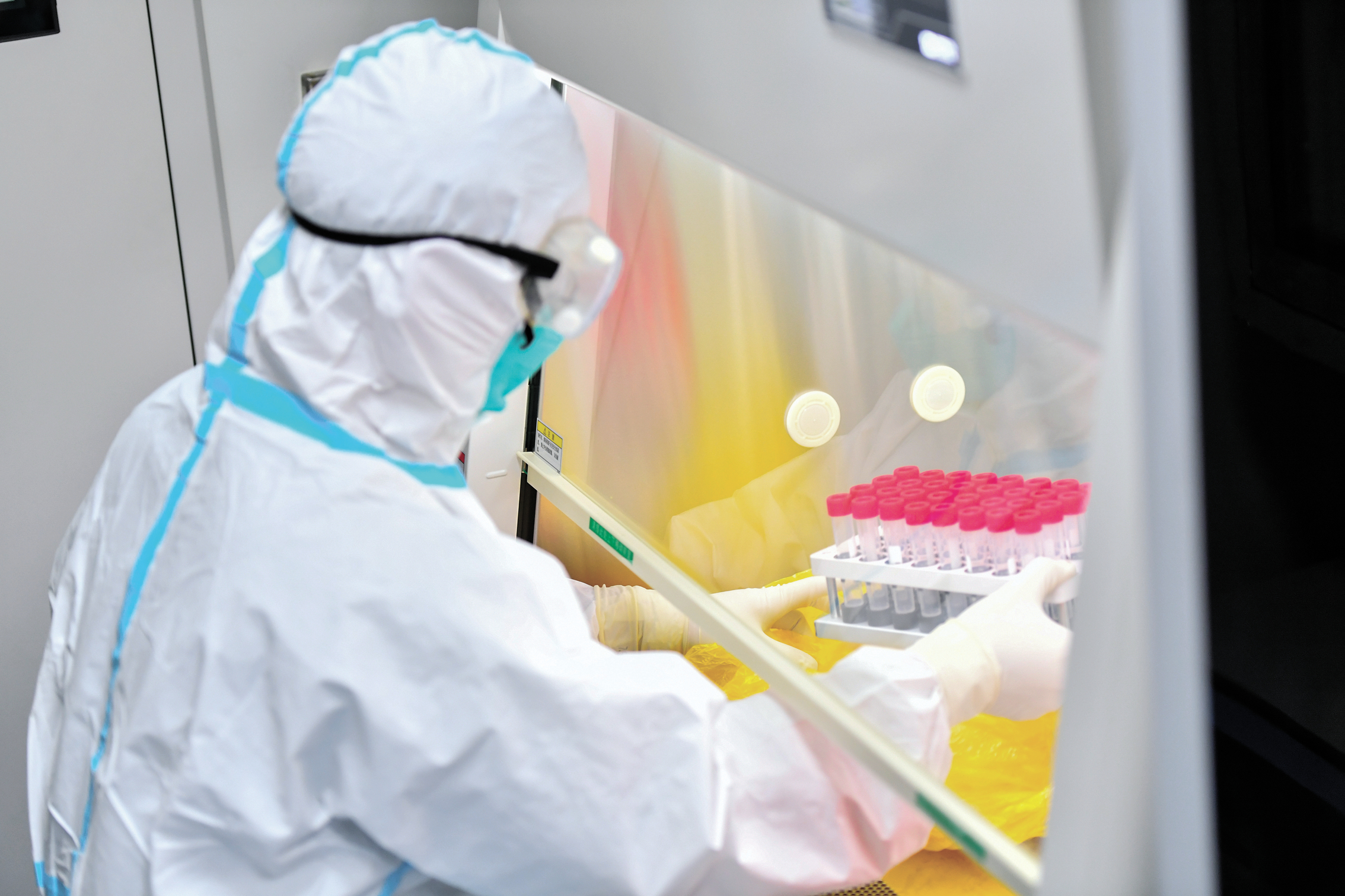 昨日,位於湖南省株洲市中心醫院的集成式自動化核酸檢測實驗室進入調試階段,醫護人員模擬取出核酸標本,今天正式投入運行。新華社
