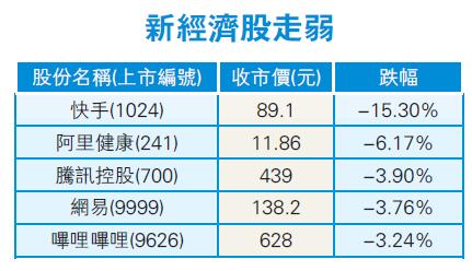 內地短視頻平台快手(1024)主要股東及基石投資者6個月禁售期已解禁,快手股價再跌至新低,失守100元,低見88.7元,收市跌15%,報89.1元,跌16.1元,另一視頻平台嗶哩嗶哩(9626)亦跌3%,報628元。