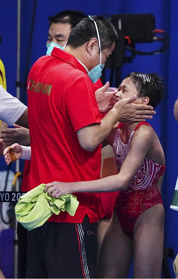 全紅嬋(右)在比賽後與教練相擁慶祝。新華社